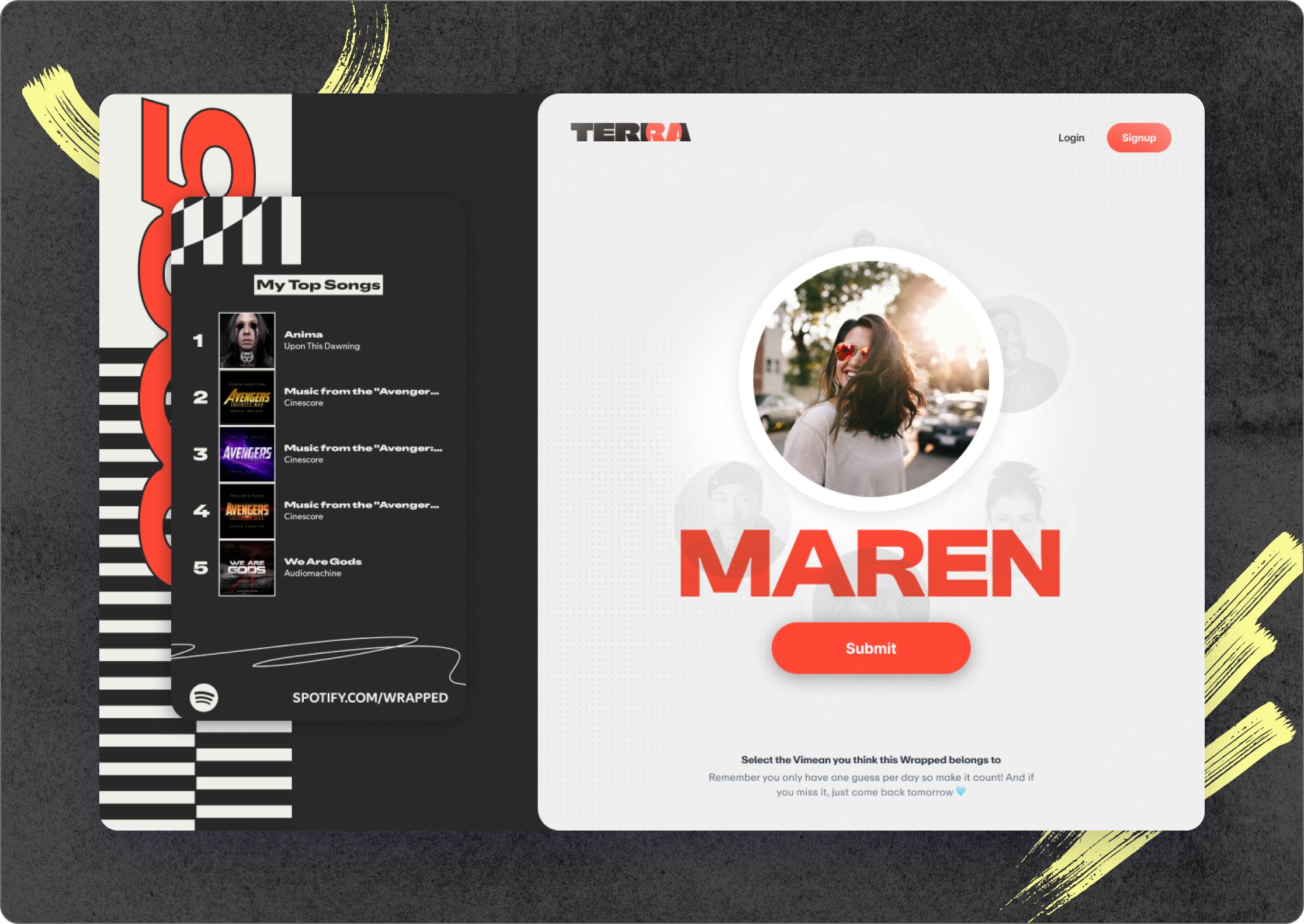 Terra is an internal daily guessing game I built at Vimeo where players identify which teammate's music recap (Spotify or Apple Music) they're viewing. Each day offers one guess with immediate feedback.